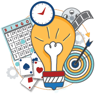 icon, graphic of different activities, bingo, cards, movies, and lightbulb